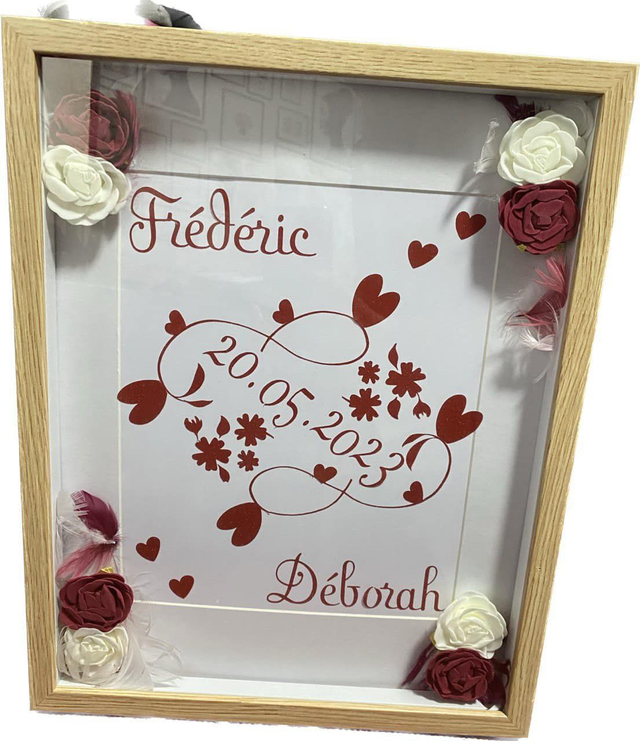 Les prénoms des mariés peuvent être gravés, imprimés ou découpés dans le matériau du cadre. Cela peut se faire par différentes techniques, comme la gravure laser, l'impression numérique ou la sérigraphie.